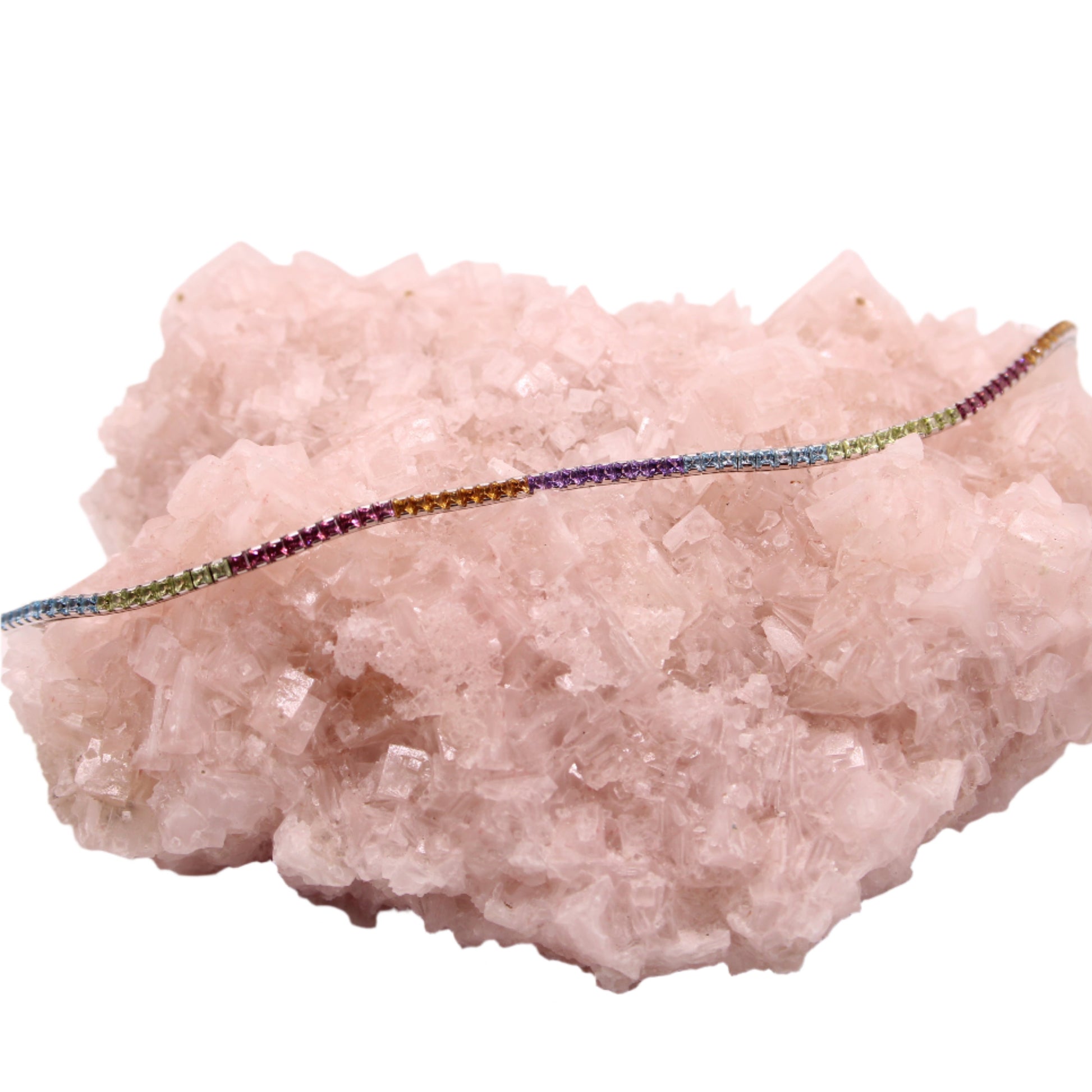 Spoil yourself with this gorgeous rainbow sapphire tennis bracelet crafted in solid 10k white gold.