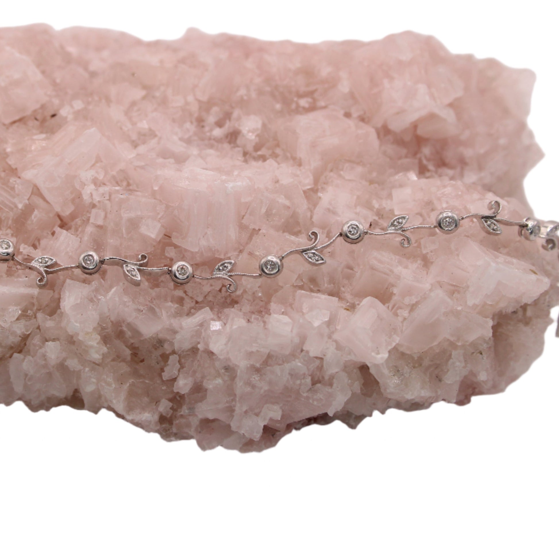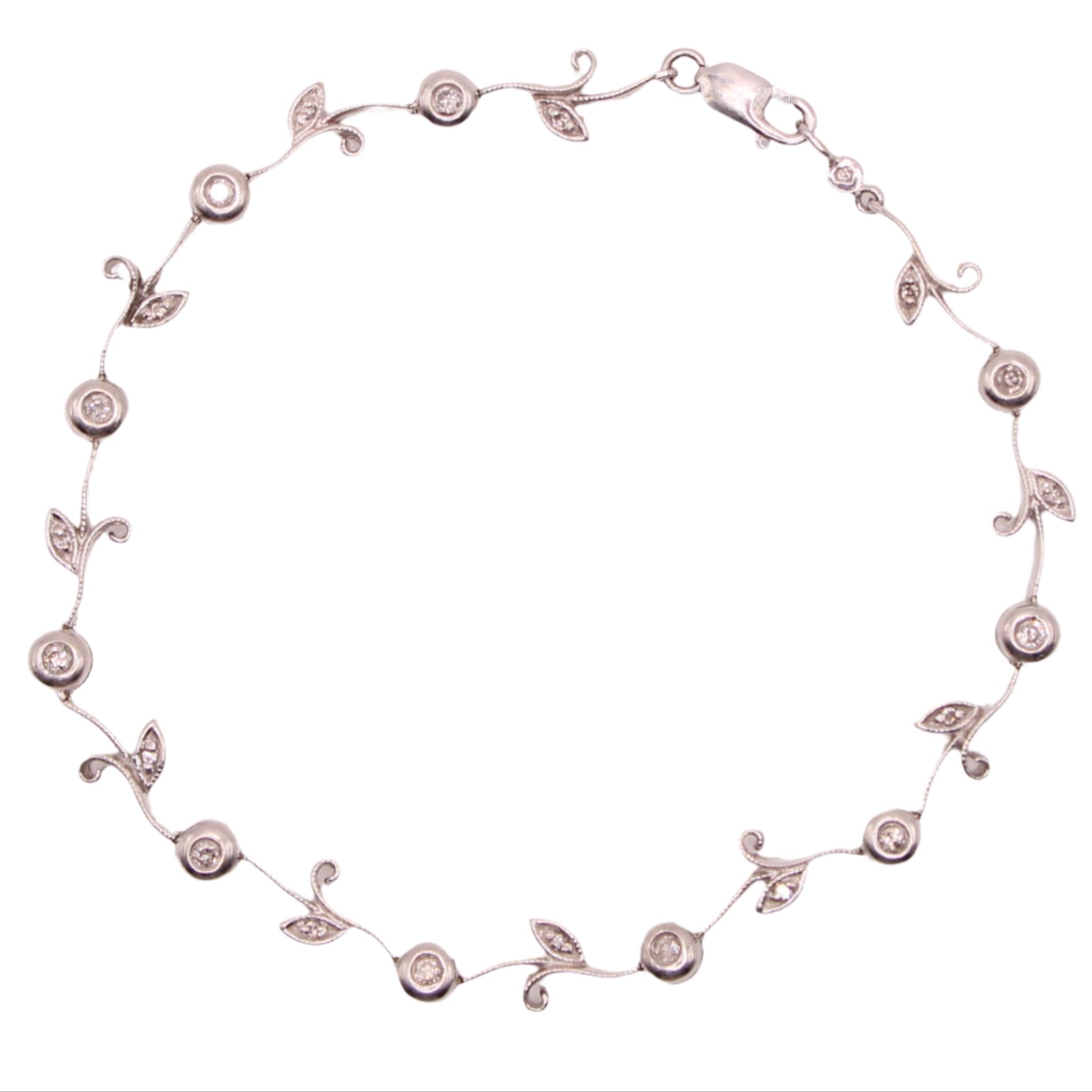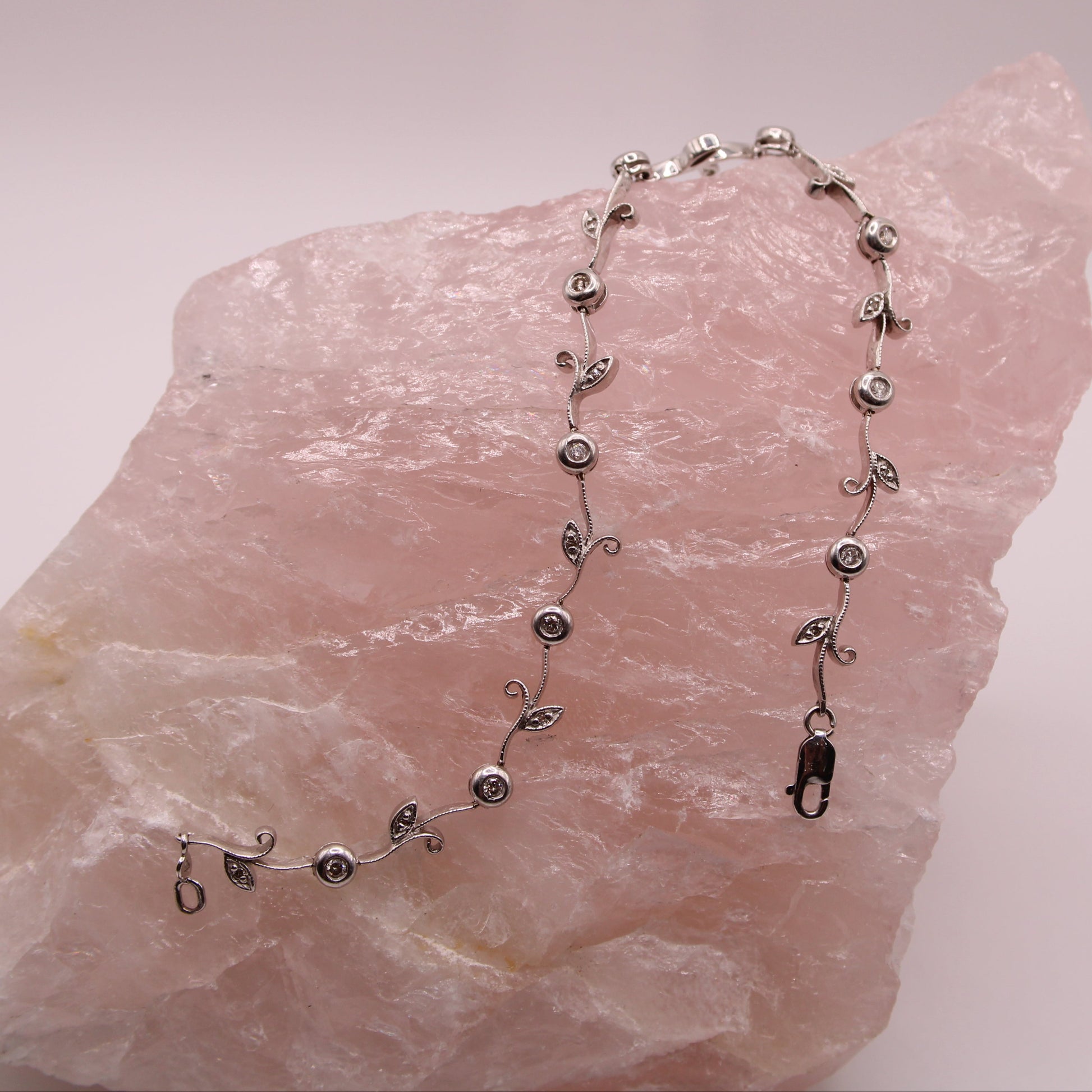 Treat yourself with this adorable white diamond vine bracelet crafted in solid 14k gold. Features bezel set diamond stations with elegant vine motifs.