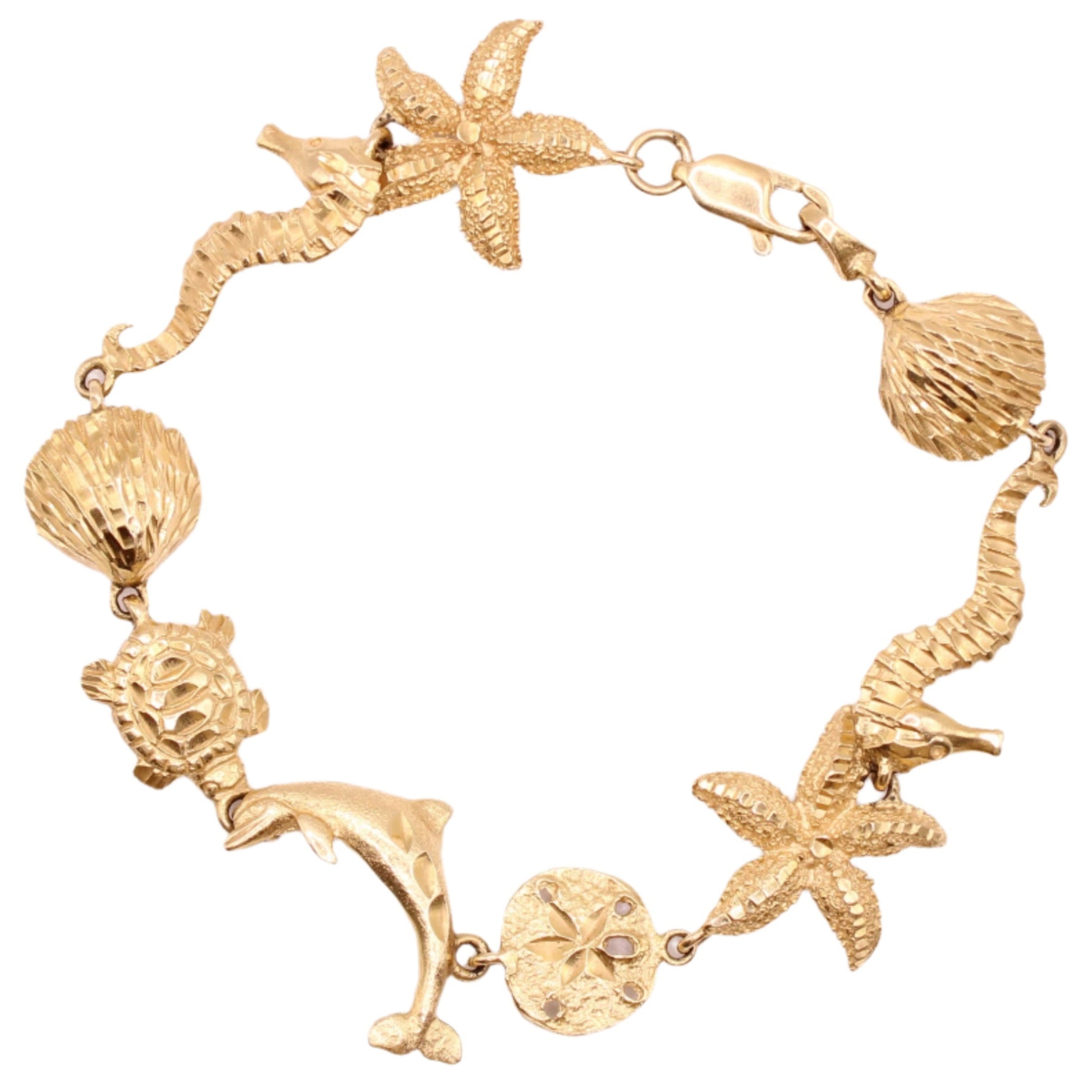 Treat yourself with this adorable oceanic sea life charm link bracelet crafted in solid 14k yellow gold. Includes dolphin, starfish, sand dollar, turtle, and seashorse links.