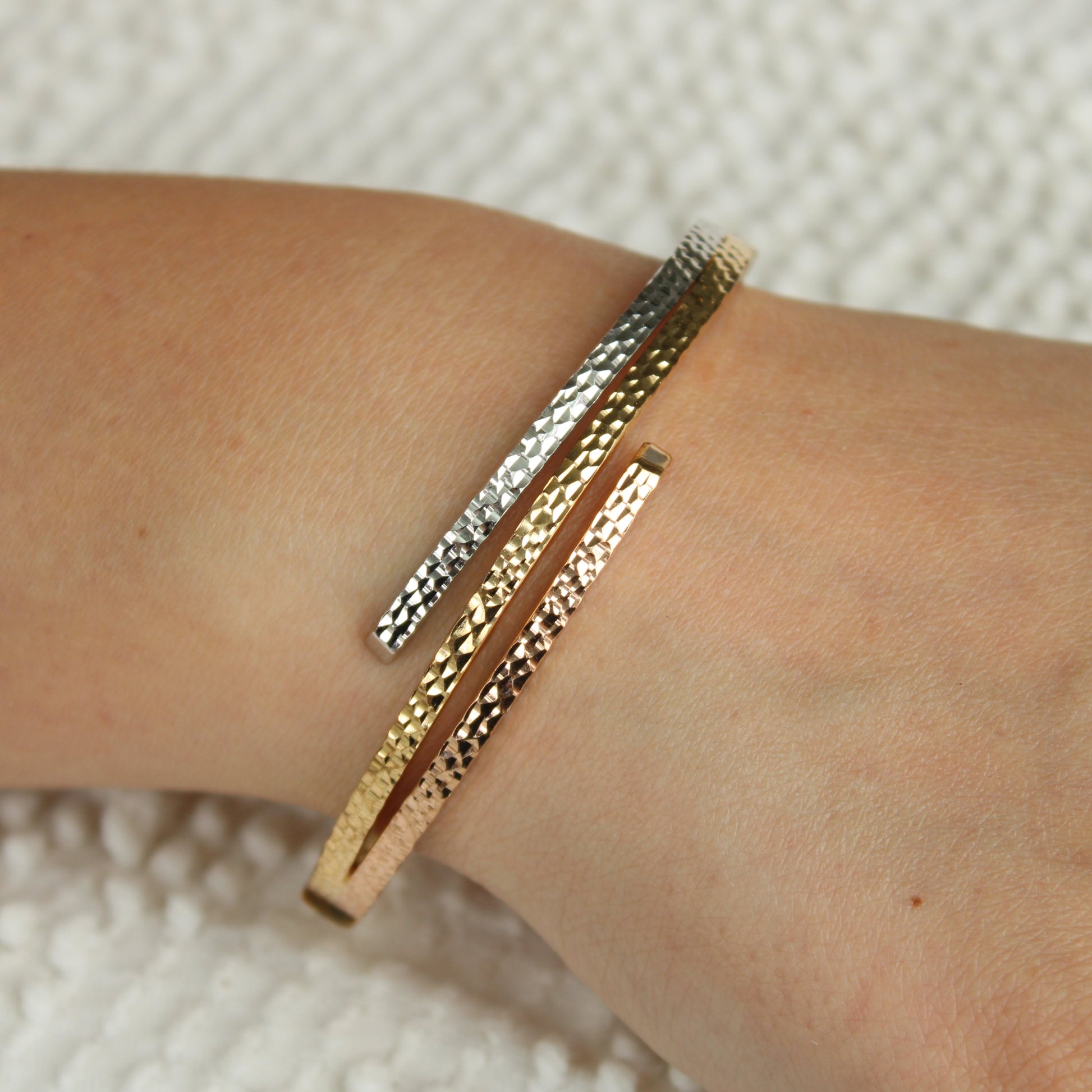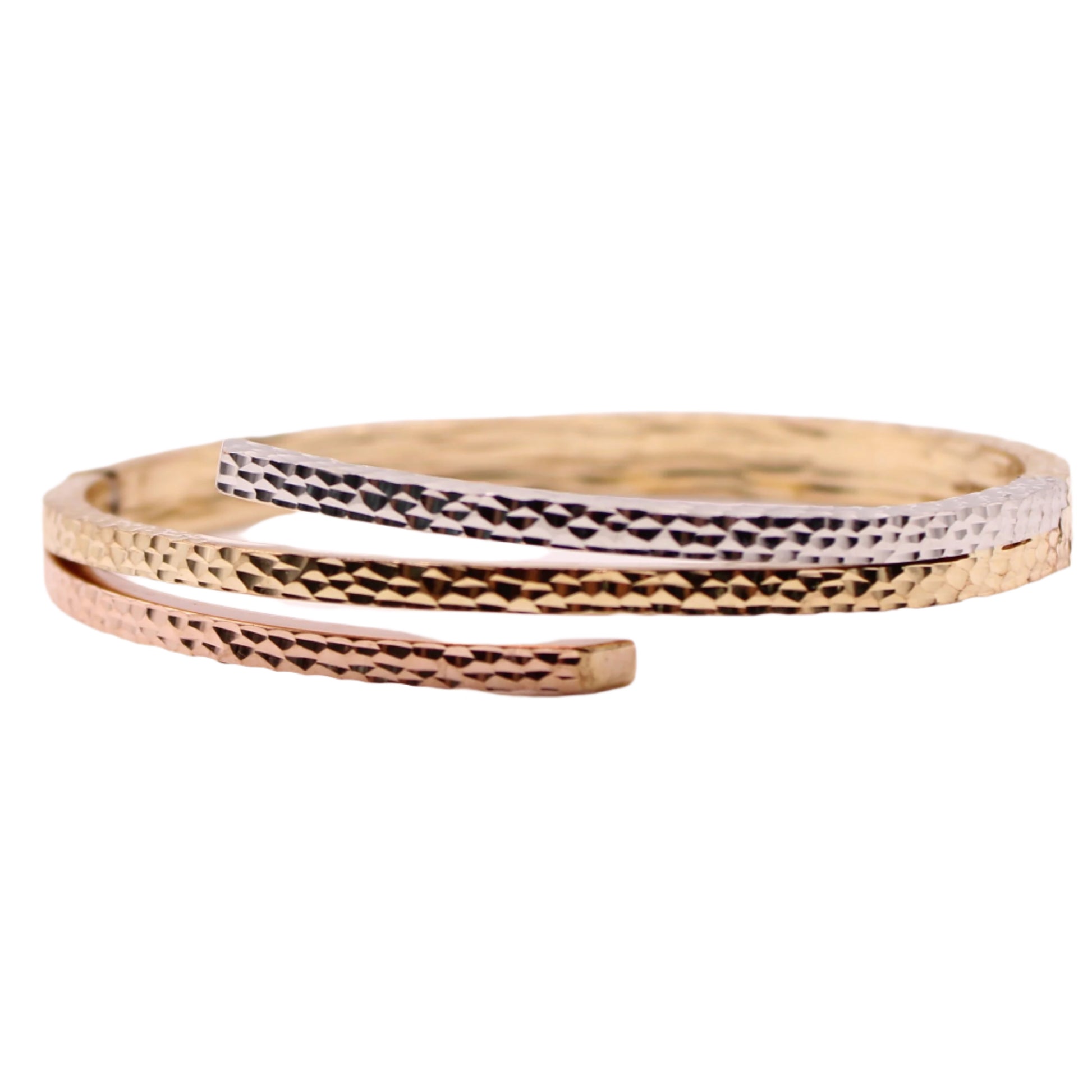Treat yourself with this daring Tri-Color Bypass Bangle Bracelet crafted in solid 14k yellow, white & rose gold. Opens fully with hinged side and very secure tab closure.