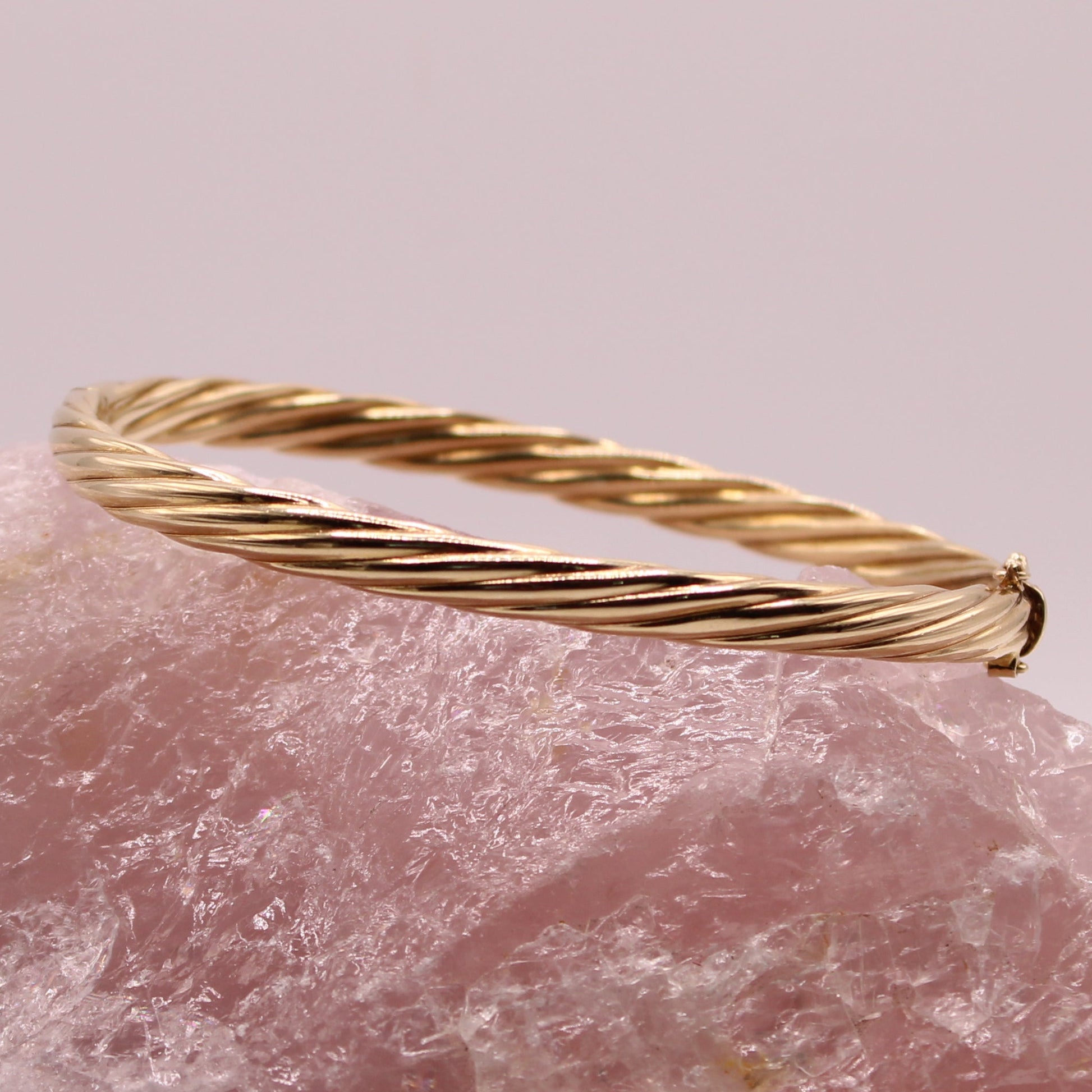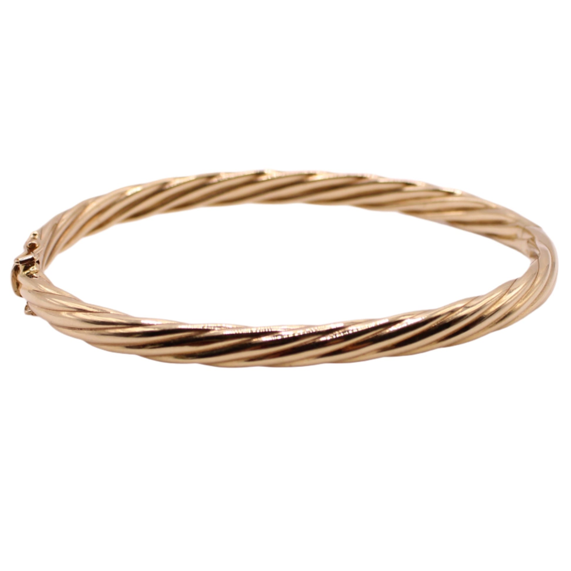 Treat yourself with this substantial vintage cable twist bangle bracelet crafted in solid 14kt yellow gold. Hinged opening with tab closure and double safety clasp.
