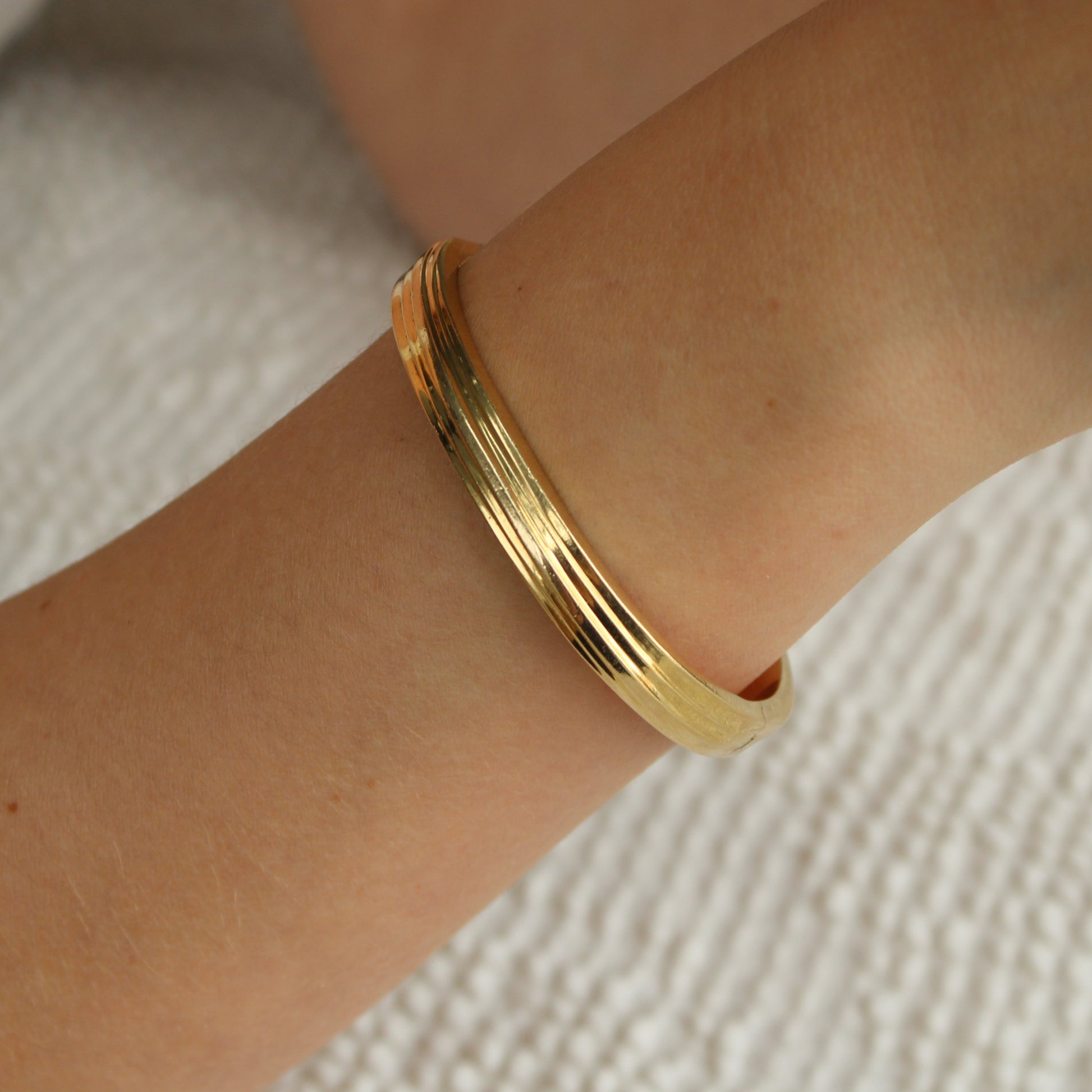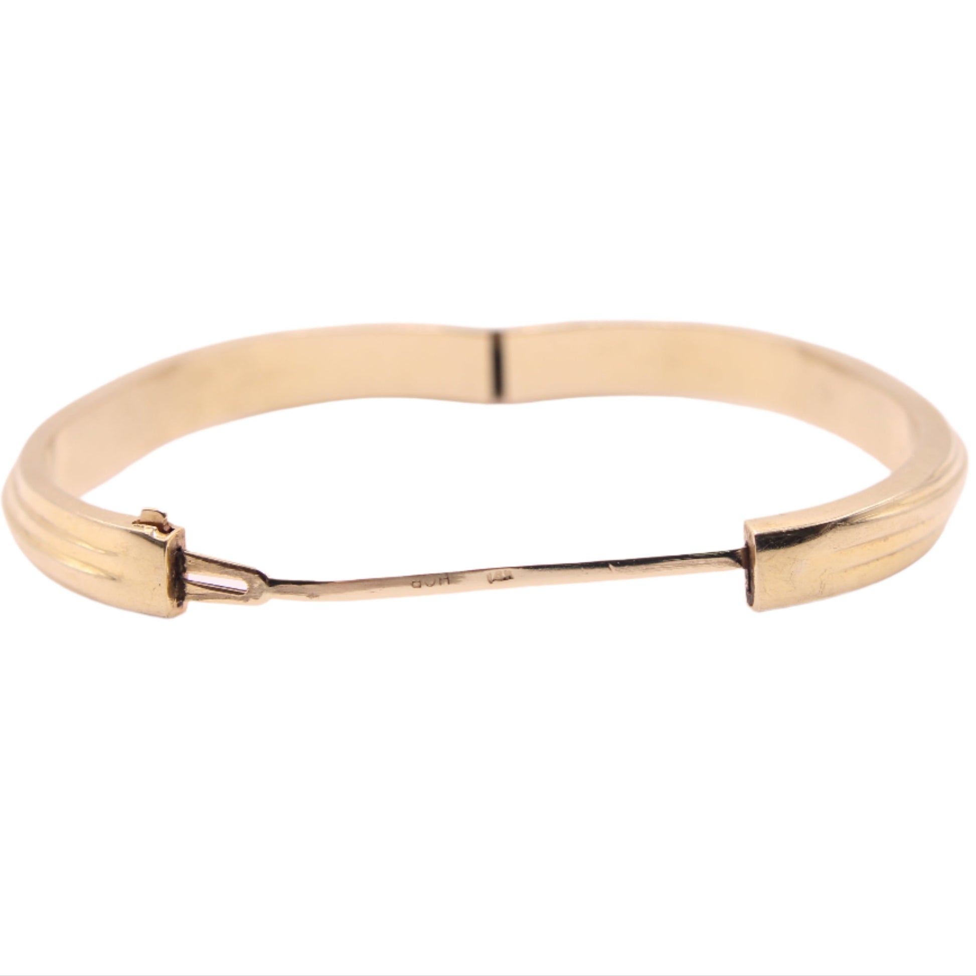 Treat yourself with this adorable vintage bangle crafted in solid 14k yellow gold. Classic hinged closure with safety bar and tab for extra security.