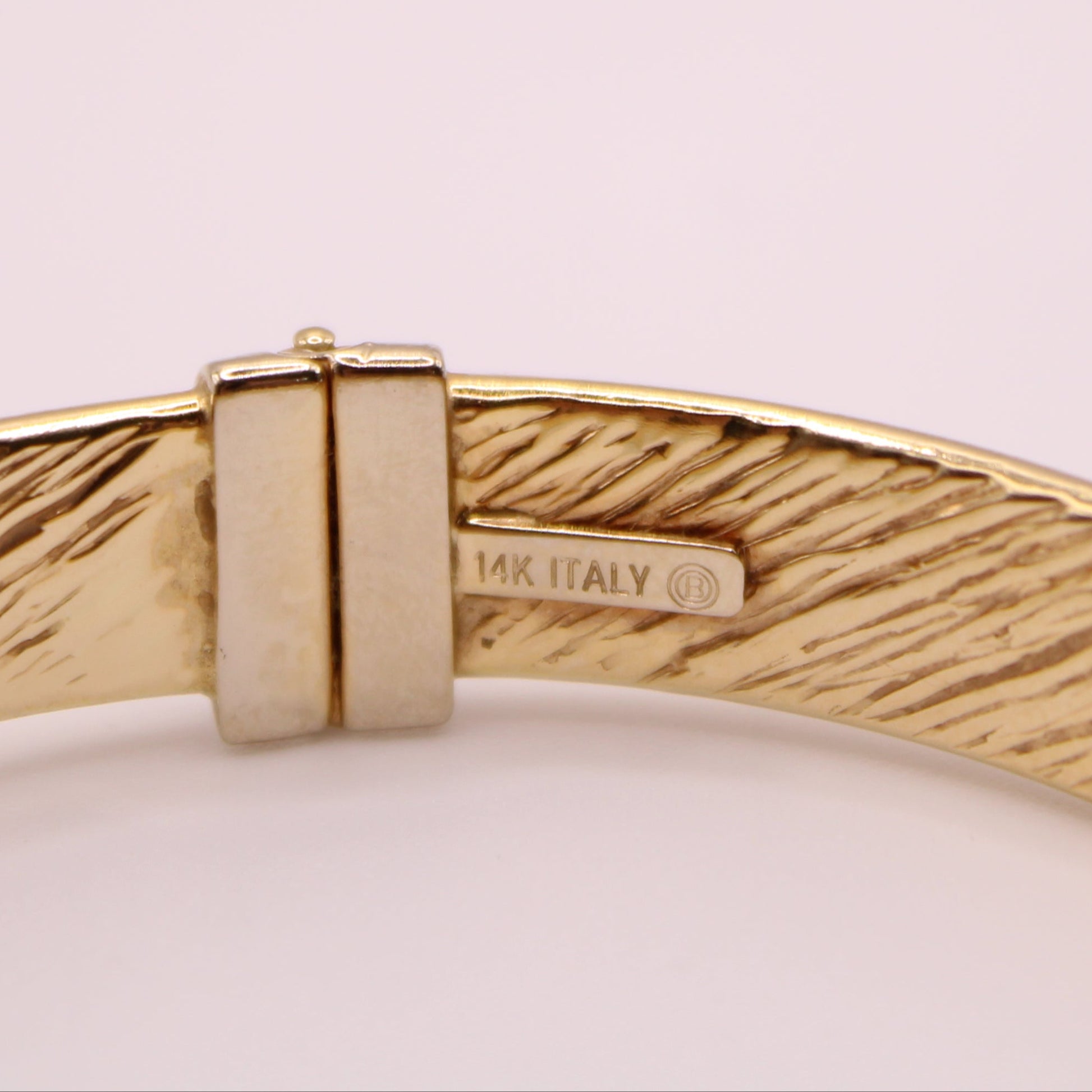 Adorn yourself with this classy striped texture bangle bracelet by H.W. Burdick crafted in solid 14kt yellow gold. Sturdy hinged closure with safety clasp.