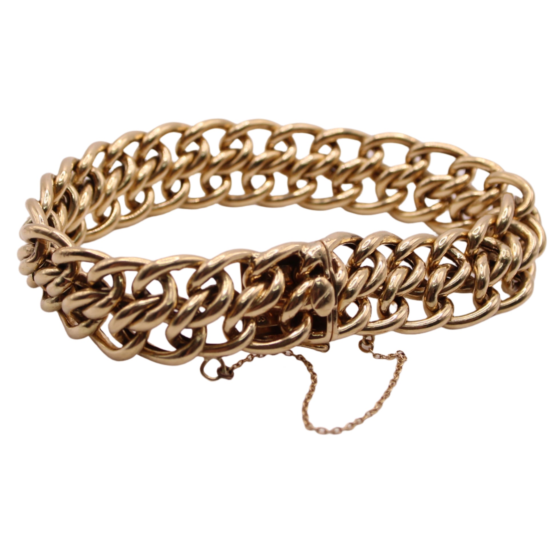 Spoil yourself with this gorgeous vintage double curb link bracelet crafted in solid 14k gold. Substantial weight and superior craftsmanship - a rare find of 100% solid intertwined links with large invisible tab closure, safety chain, and an extra side clasp for complete peace of mind!