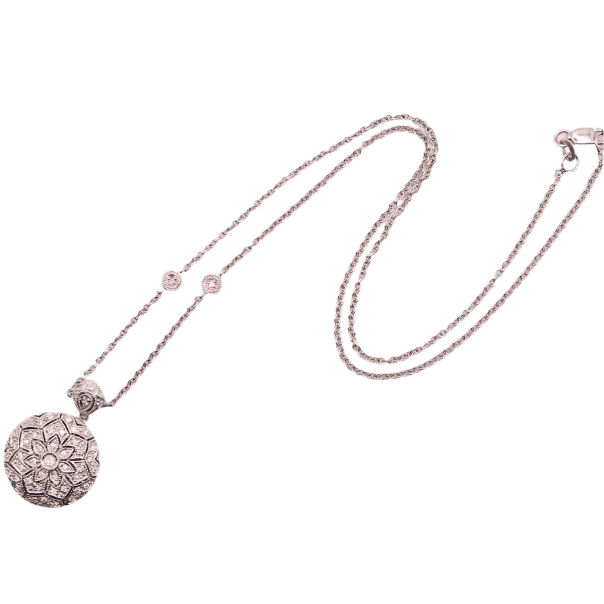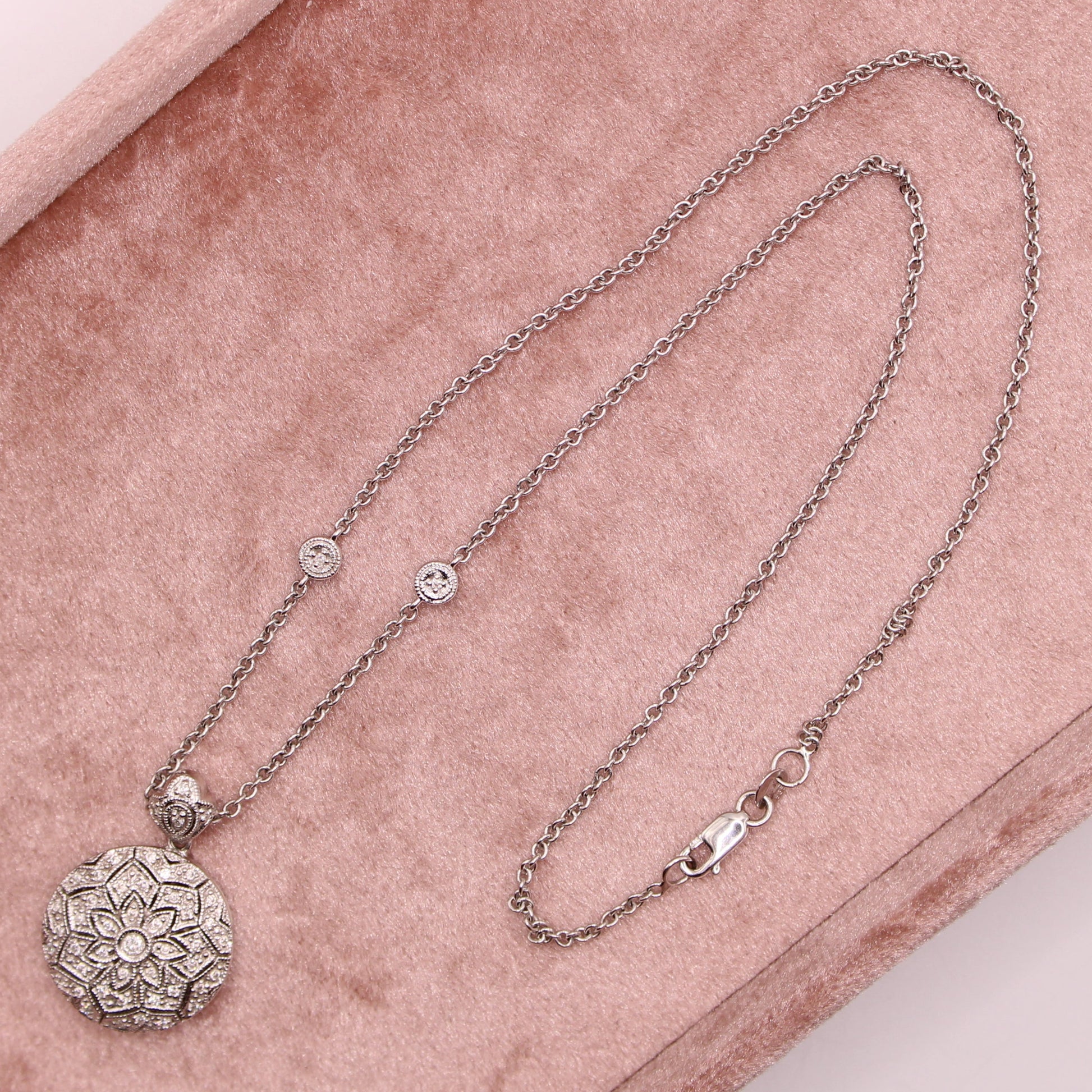 Treat yourself with this amazing diamond locket necklace crafted in solid 14k white gold. Front of locket features a full mandala flower like design filled with sparkling diamonds. 2 diamonds stations accentuate the chain and keep the locket in place between them. Original cost was over $3000!