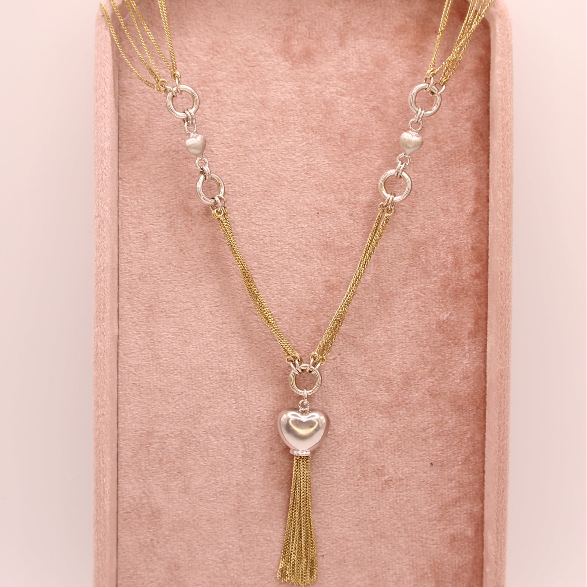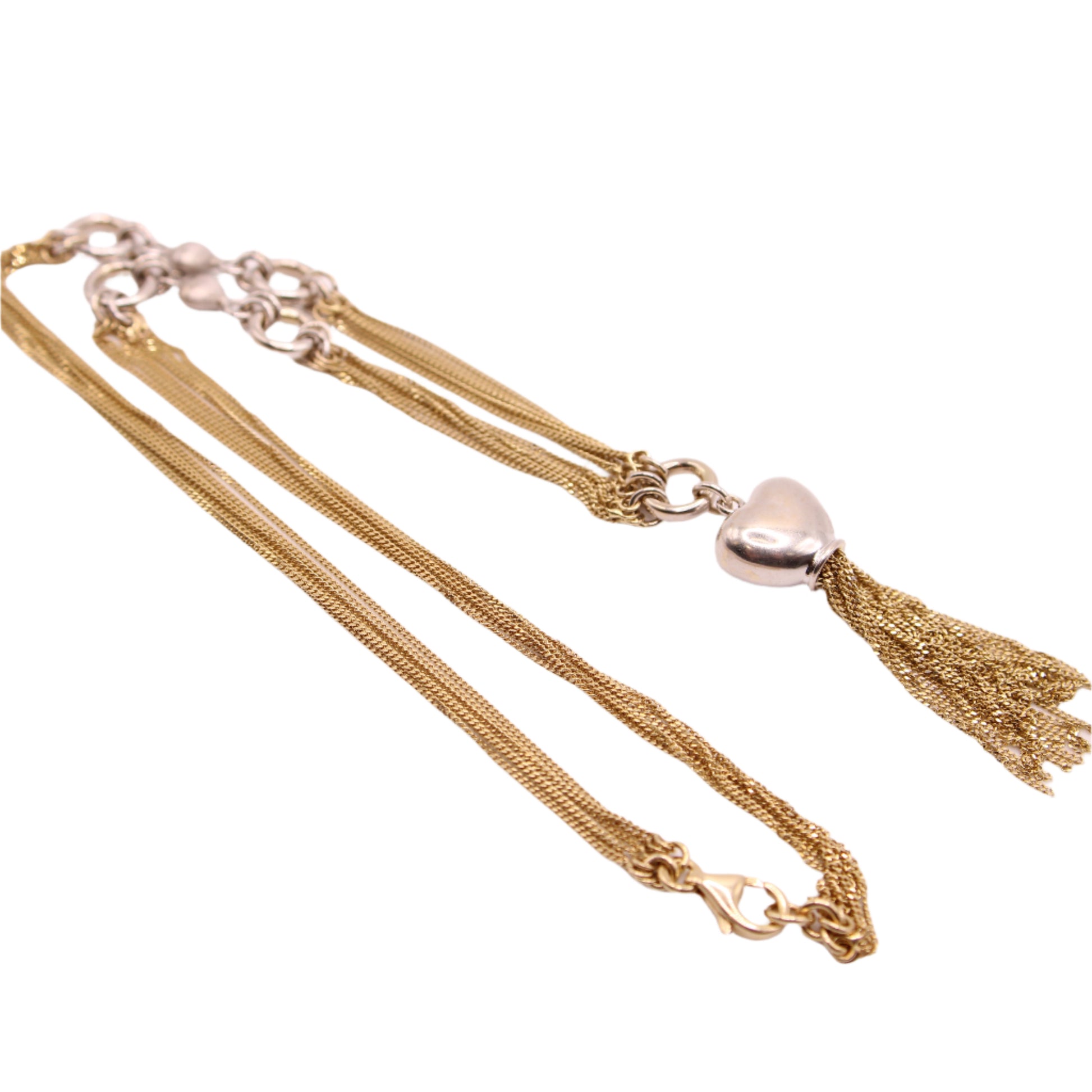 Spoil yourself with this stunning two tone multi-strand fringe necklace crafted in solid 14k gold. Several fine curb chain strands linked between the white gold loops, white gold heart station charms, and fringe flowing from the center heart. Resembles high designer pieces by YSL & Hermes.