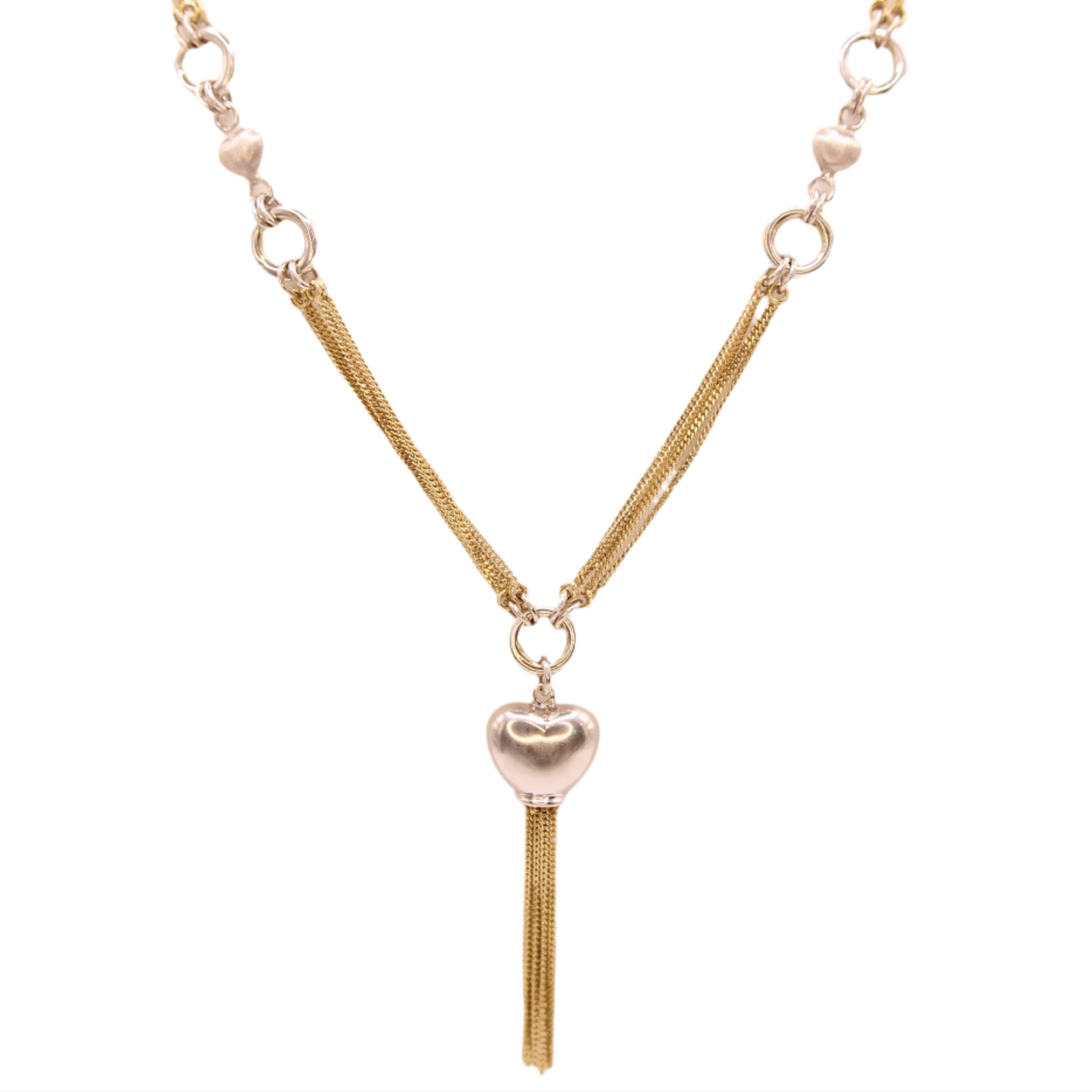 14kt Two Tone Yellow Gold Multi Strand Station Heart Fringe Statement Necklace