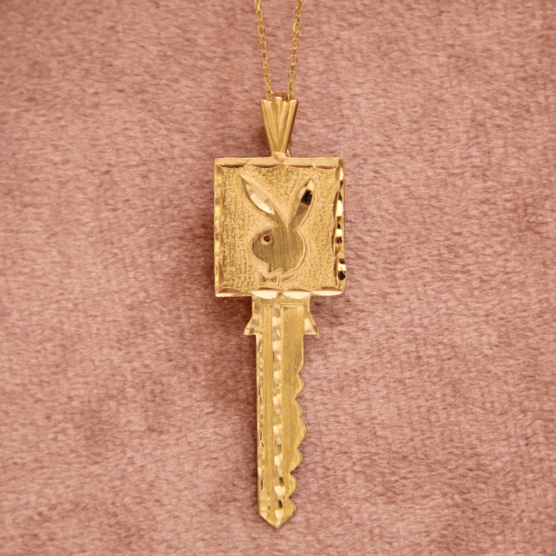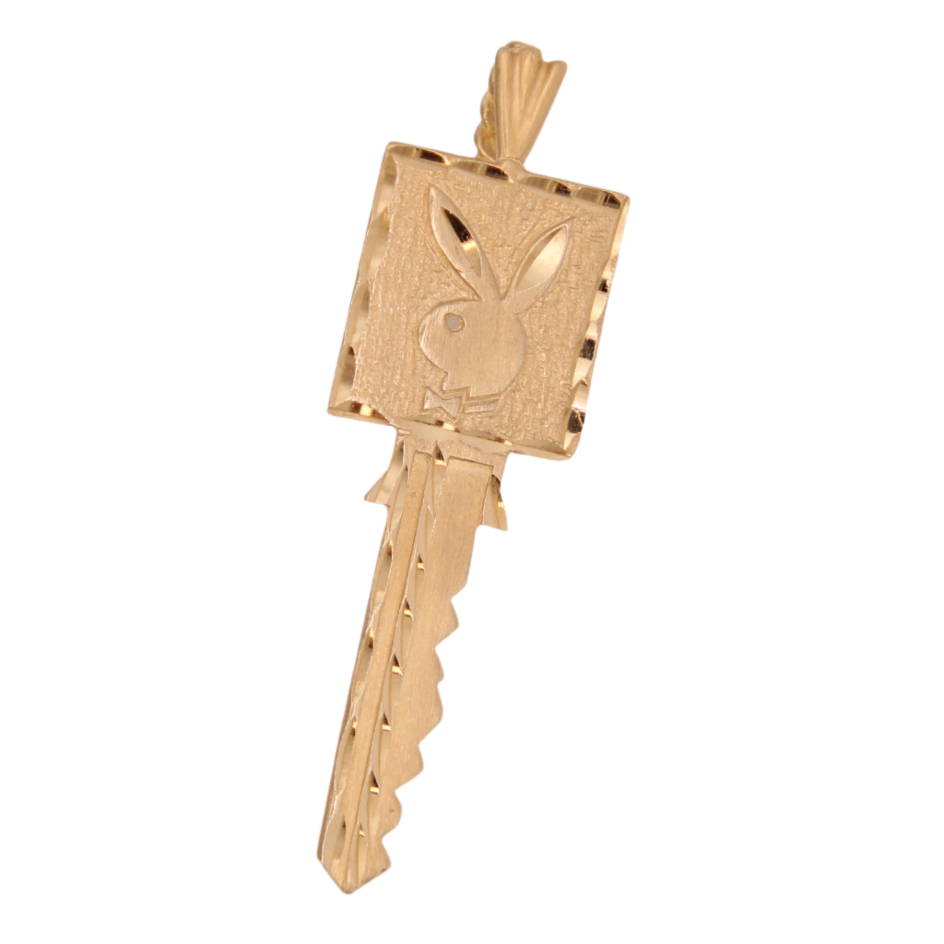 Vintage officially licensed Playboy Mansion Key pendant by Michael Anthony crafted in solid 14k gold. Playboy bunny logo with diamond cut detailing to give extra shimmer when hit by light.