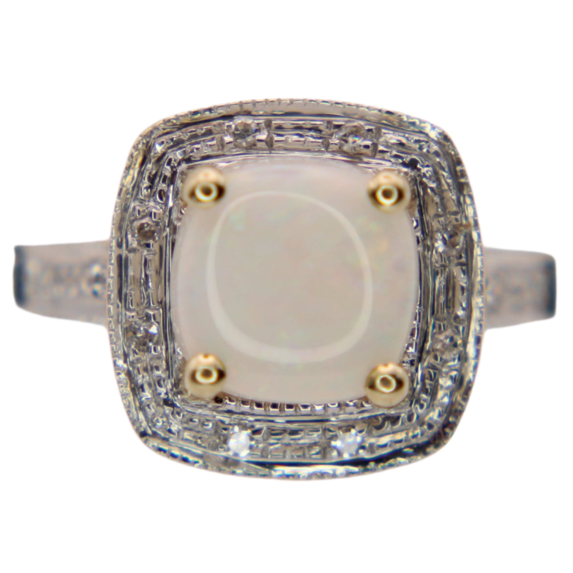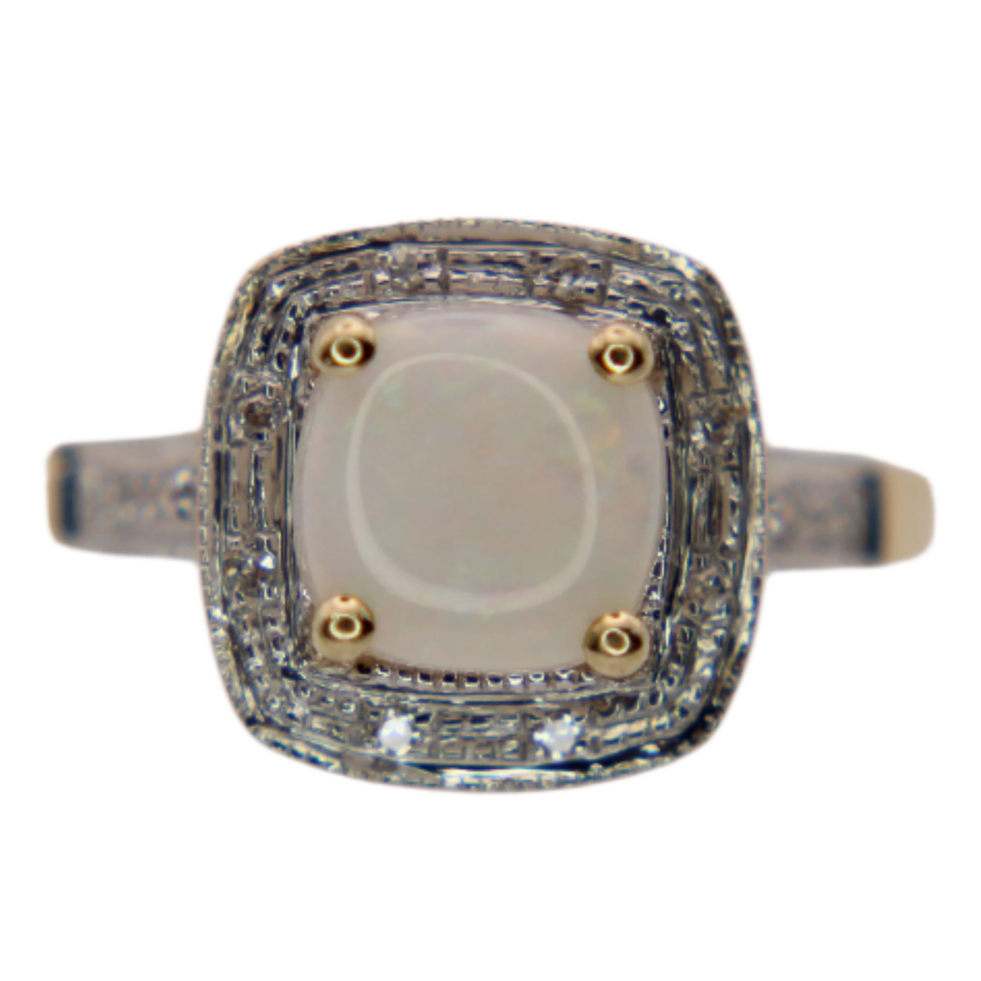 14kt Two Tone Yellow White Gold Diamond Cushion Cut Cabochon Opal Halo Ring