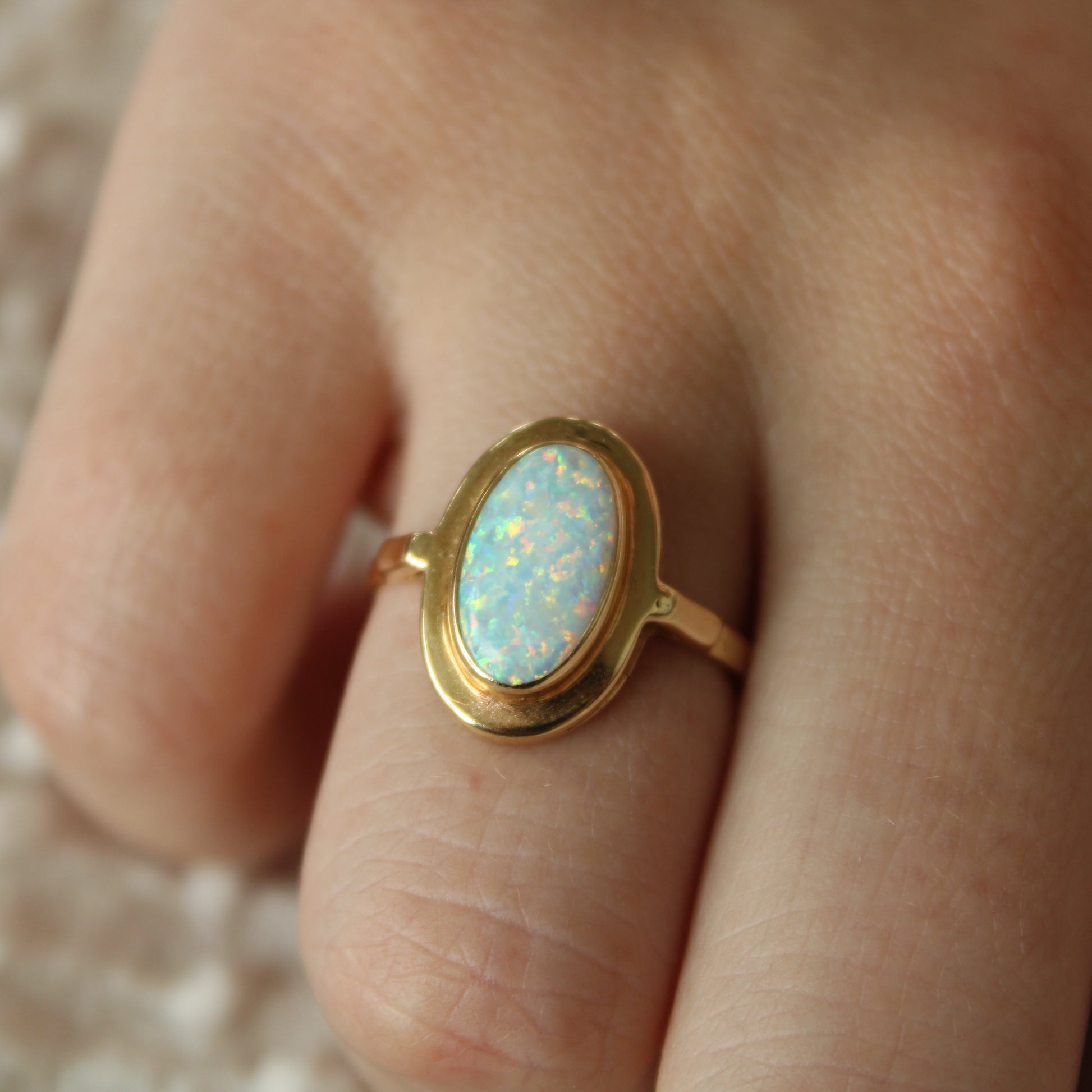 Spoil yourself with this darling bezel set oval Opal ring crafted in solid 14kt yellow gold.