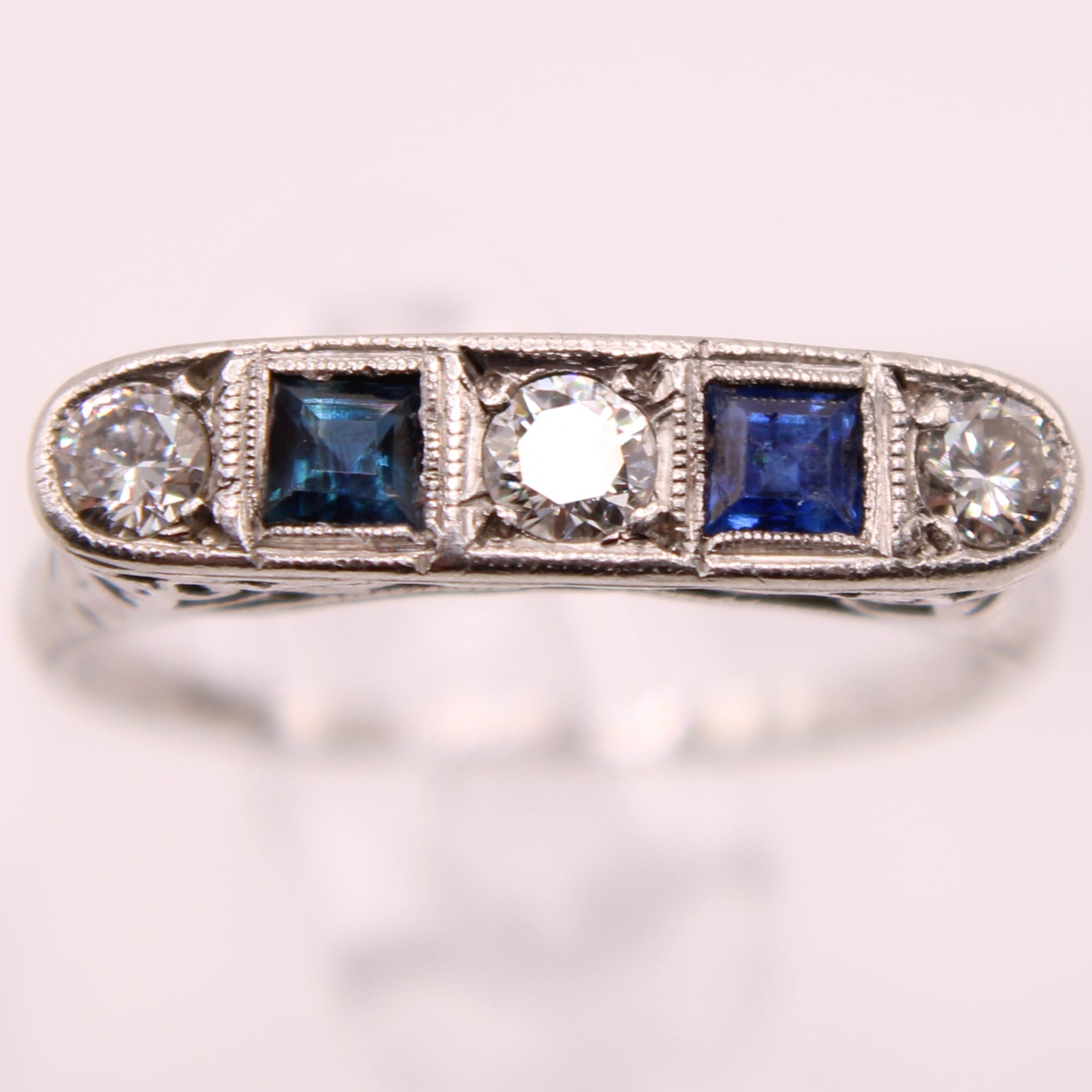 Adorn yourself with this gorgeous genuine Art Deco era ring crafted in solid platinum with diamonds and sapphires.